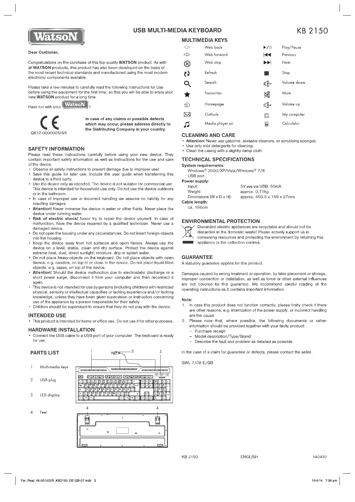 Olvassa el alább 📖 a magyar nyelvű használati útmutatót Watson KB 2150 (2 oldal) a billentyűzet kategóriában. Ezt az útmutatót 6 ember találta hasznosnak és 3.5 felhasználó értékelte átlagosan 4.4 csillagra