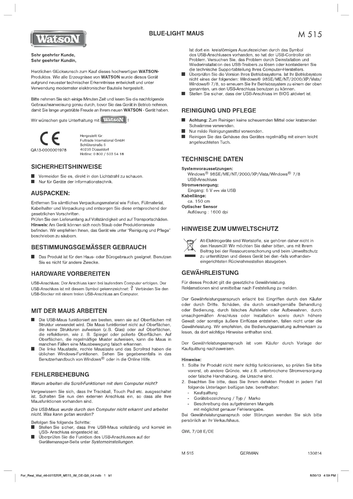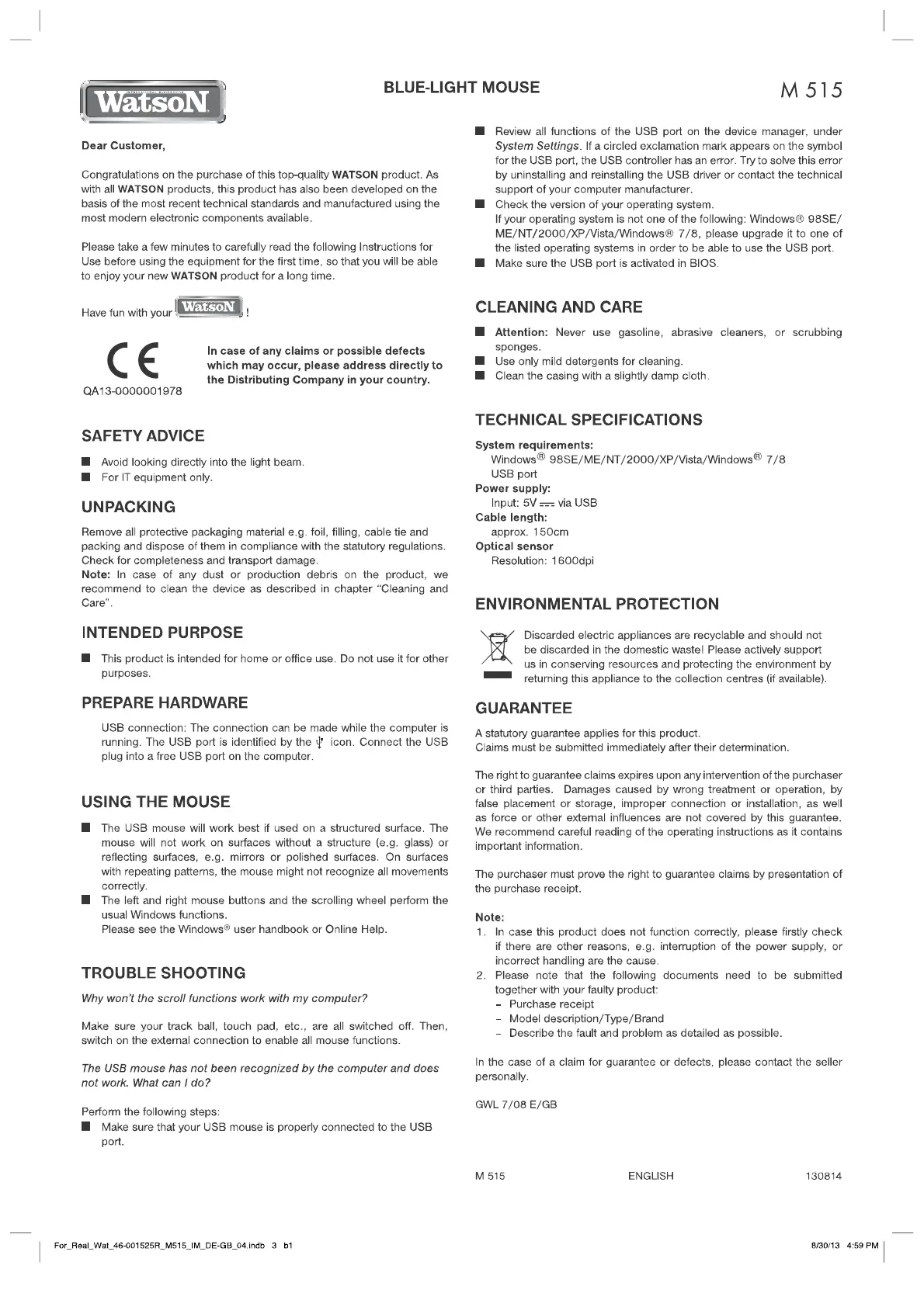 Olvassa el alább 📖 a magyar nyelvű használati útmutatót Watson M 515 (2 oldal) a egér kategóriában. Ezt az útmutatót 6 ember találta hasznosnak és 3.5 felhasználó értékelte átlagosan 4.0 csillagra