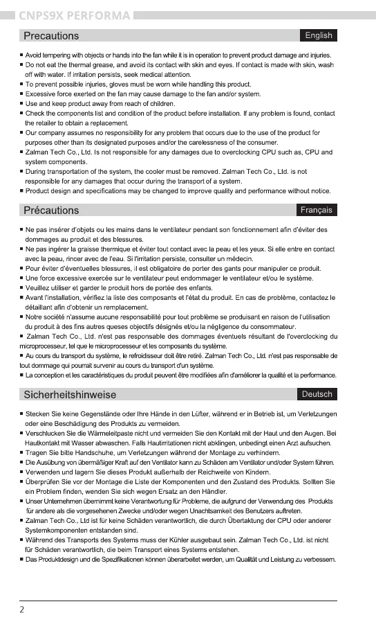 Olvassa el alább 📖 a magyar nyelvű használati útmutatót Zalman CNPS9X Performa (20 oldal) a Hardverkoeling kategóriában. Ezt az útmutatót 10 ember találta hasznosnak és 5.5 felhasználó értékelte átlagosan 3.6 csillagra